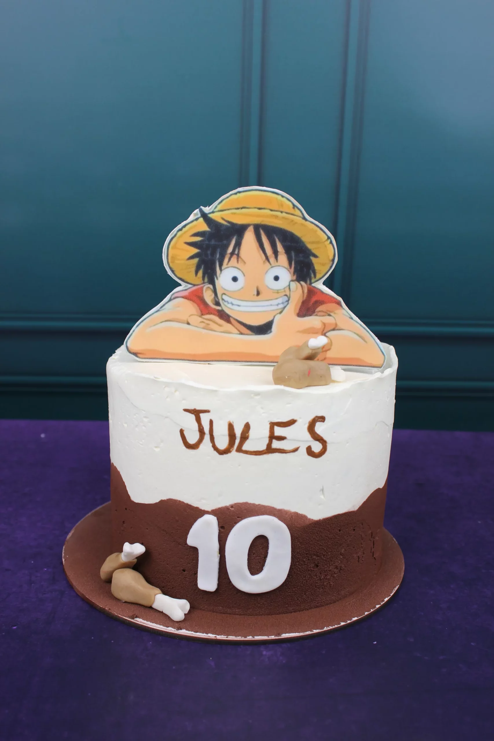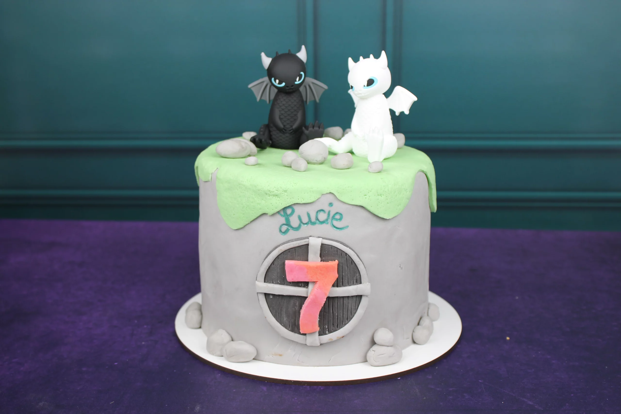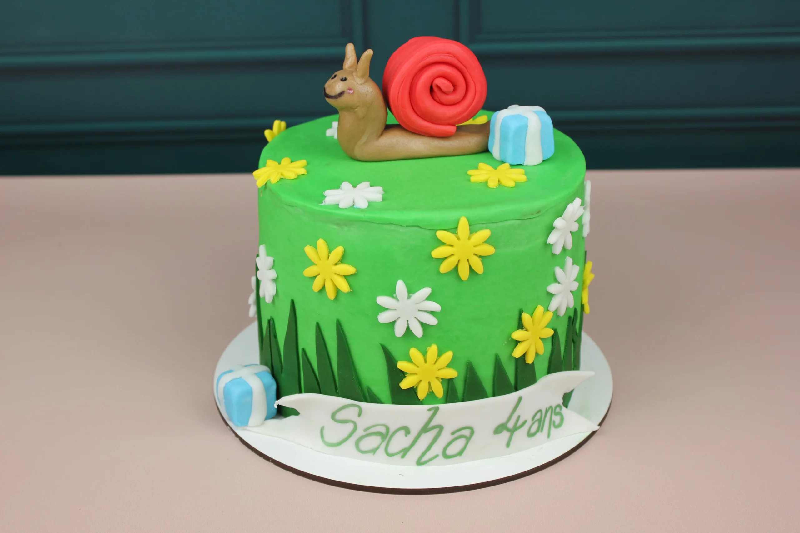 Utilisant la même base, ce gâteau est habillé de pâte à sucre pour une décoration sur mesure.